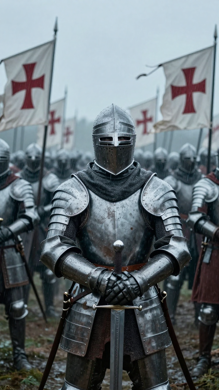 a 13th century English Templar knight in weathered full-body steel armor, his expression grim beneath a dented great helm as he grips a longsword tightly in one gauntlet, standing shoulder to shoulder with endless rows of fellow armored knights beneath pouring rain on a muddy battlefield, each bearing white banners marked with the crimson St. John’s cross that whip violently in the wind, the overcast sky casting a cold blue-grey pall over the scene, captured on gritty 35mm film through a slightly fogged medieval war documentary lens.