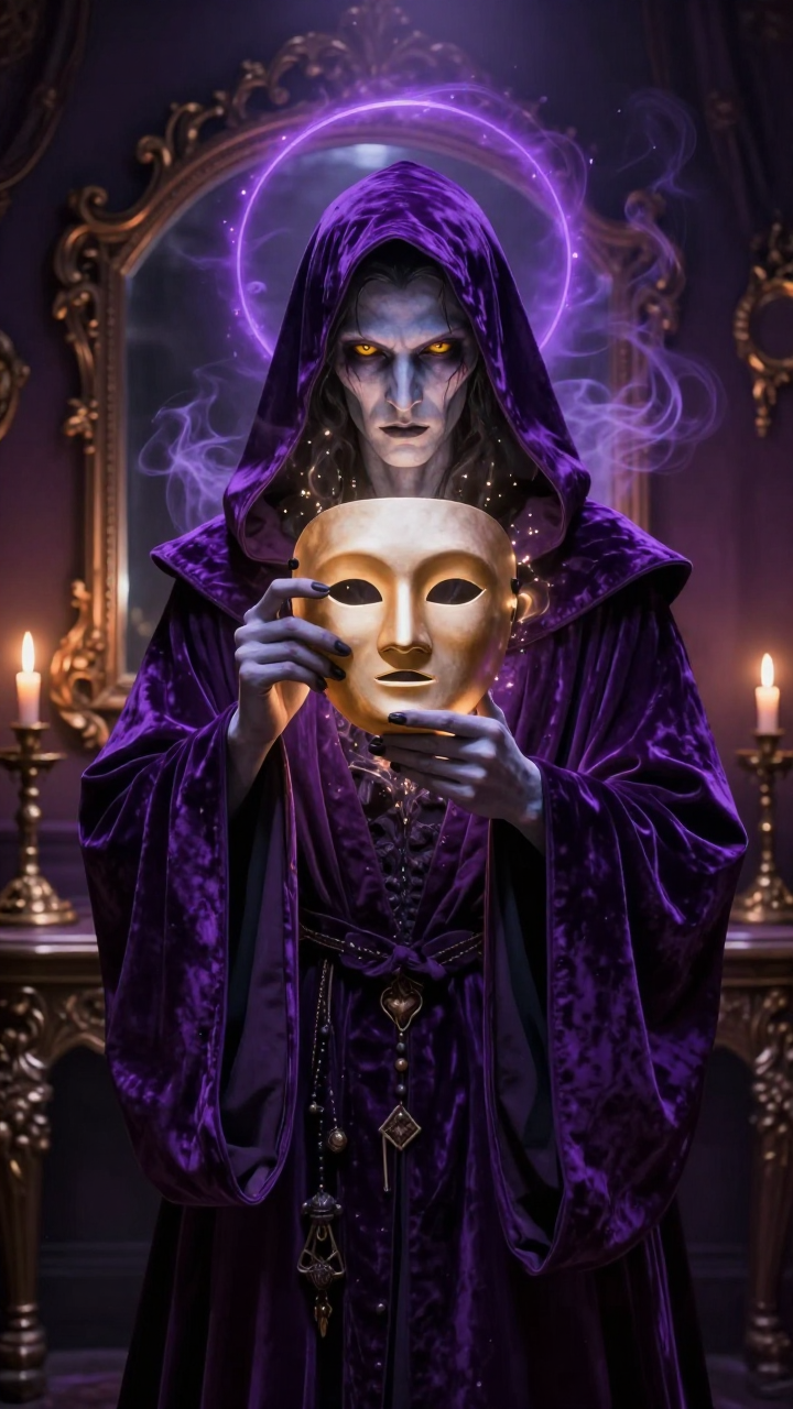 An ancient hooded magician with pale ethereal bluish-grey skin and intense glowing amber eyes holds a delicate theater mask before his face, his own angular features partially transparent and dissolving into luminous particles of golden light. He stands before an ornate vintage mirror in a shadowed Victorian dressing room filled with arcane artifacts. A single beam of warm amber spotlight creates dramatic shadows across his weathered mystical visage. Dramatic rim lighting edges his flowing deep royal purple velvet robes and hood, while a soft purple magical aura radiates as a halo behind his head. Ethereal arcane mist swirls through the scene, and bioluminescent particles drift in the air. Smooth polished digital painting, fantasy concept art, high contrast, high saturation, deep royal purple dominant palette with electric violet and indigo tones, sharp focus, majestic and mystical atmosphere.