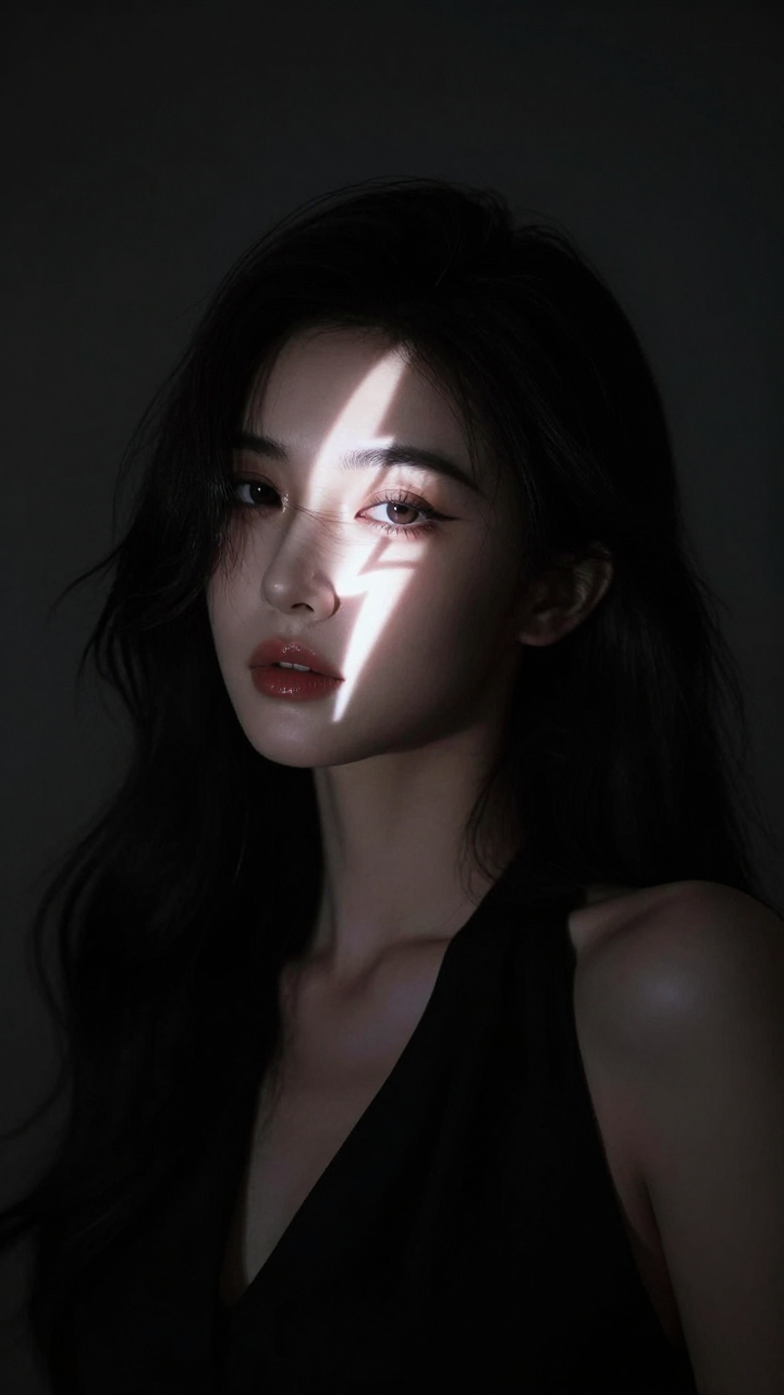 极具氛围感的暗调人像,一位优雅的中国美女在黑暗的房间里。一束强光通过遮光板,在她的脸上投射出一个清晰的闪电形状的光影,正好照亮一只眼睛。高对比度,明暗交界清晰,神秘感,莱卡相机色调。