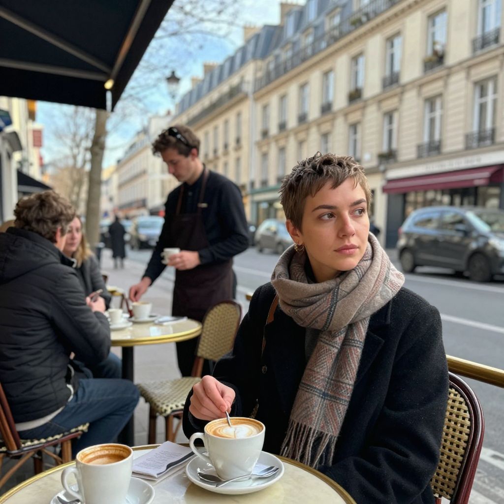 Generate a photorealistic image of a cafe terrace in the Marais district of Paris on a Wednesday morning in March 2025. It is a crisp, cool spring morning with clear skies. Locals are drinking coffee. In sharp focus should be a young woman with a pixie cut wearing a scarf, stirring a cappuccino and looking thoughtfully to the side; the waiter and street traffic behind her are blurred. The photo should have the candid, natural morning light feel of an iPhone image.