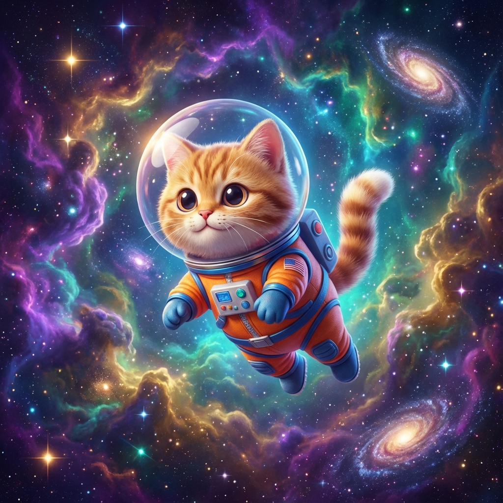 A cute astronaut cat floating in space with colorful nebula background, 3d render, 3:4 aspect ratio, vibrant colors.