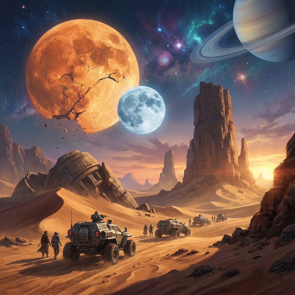 A wide angle shot of a vast desert landscape with double moons, sci-fi concept art, 16:9 aspect ratio, dramatic lighting.