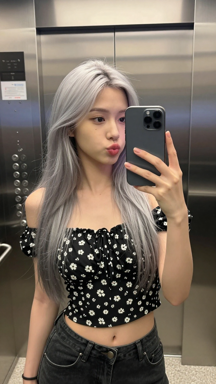 一张中景手机自拍照片拍摄了一位留着长银发的年轻东亚女子在灯光明亮的电梯内对着镜子自拍。她穿着一件带有白色花朵图案的黑色露肩短上衣和深色牛仔裤。她的头微微倾斜,嘴唇嘟起做亲吻状,非常可爱俏皮。她右手拿着一部深灰色智能手机,遮住了部分脸,后置摄像头镜头对着镜子